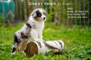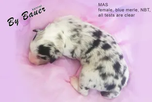 Сука, окрас голубой мрамор с белым и подпалом, глаза карие, НБТ (куцехвостая).