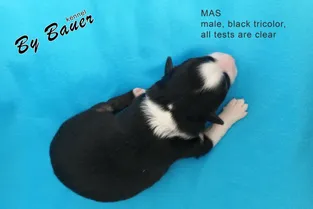 Кобель, окрас черный триколор, глаза карие, хвост купирован.