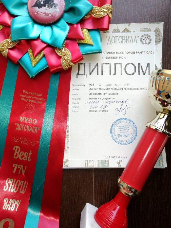 16.12.22. Национальная выставка собак пород 1 группы ранга САС г. Москва "Догсвилл-2022", эксперт Dušan Paunović Сербия. Класс беби. Оценка: очень перспектавно-1. Титулы: CW, Лучший беби, BIG-Baby-2. Эксперт на Бесте Hrachik Hakobyan, Армения.