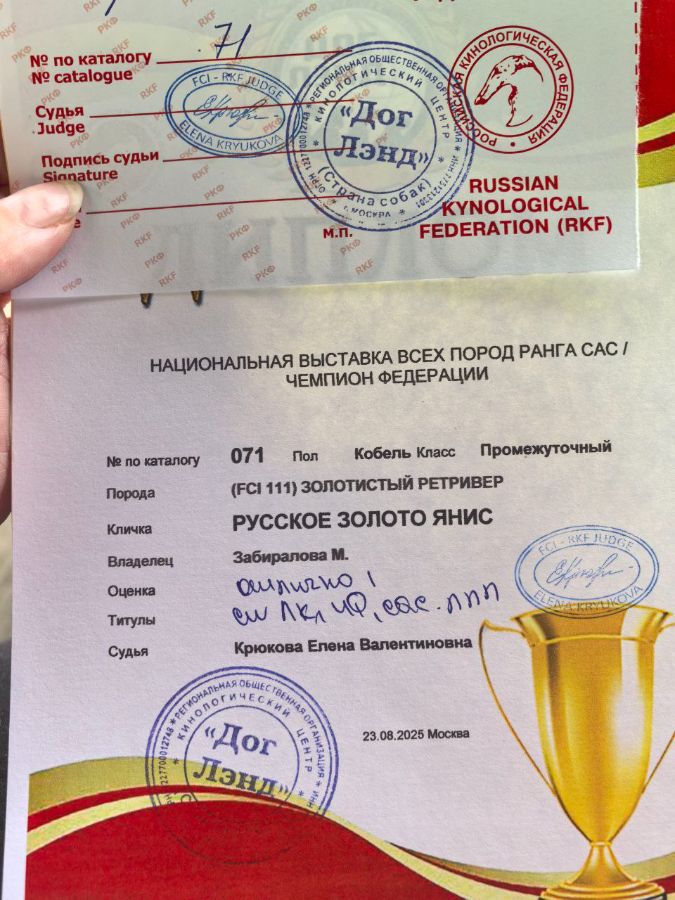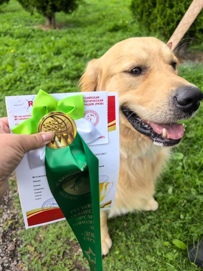 Наш выпускник голден ретривер Янис (Русское Золото Янис) очень красиво начал шоу-карьеру во взрослом классе: неоднократно ЛПП (Лучший представитель породы), CAC и Победитель среди собак 8 группы.